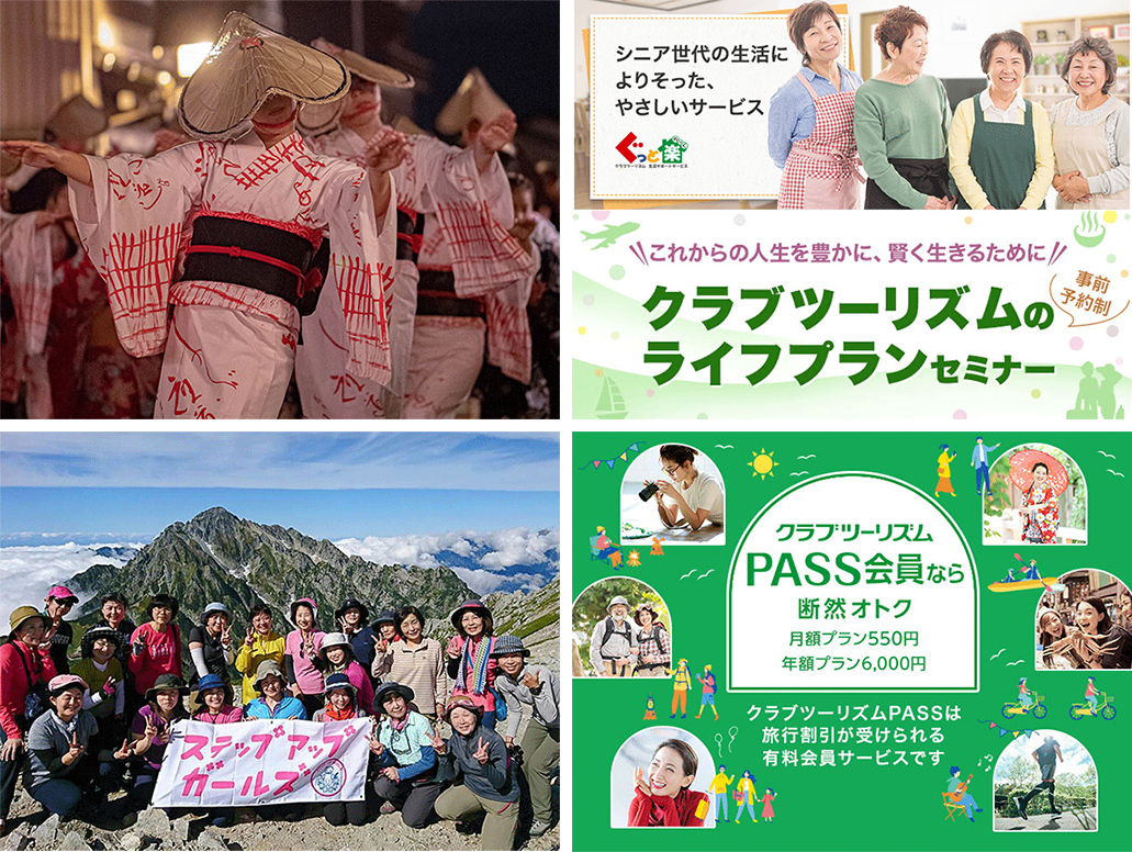 クラブツーリズムでは旅行事業に加え、暮らしをより豊かにするために「生活サポート事業」、「ライフプランセミナー運営」、「各種保険代理店事業」など、 皆さまの日常に寄り添う多彩なサービスを展開しています。