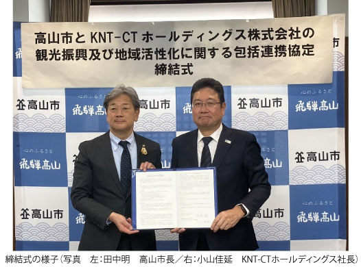 KNT-CTホールディングス株式会社(本社:東京都新宿区 社長:小山 佳延)は、2025年10月10日、岐阜県高山市と、高山市の観光資源を活用した、関係人口の増加と社会が直面する課題に対応し、地域の活性化と住民生活の向上に寄与することを目的とし、包括連携協定を締結し、同日、岐阜県高山市役所にて締結式を実施しましたので、お知らせします。