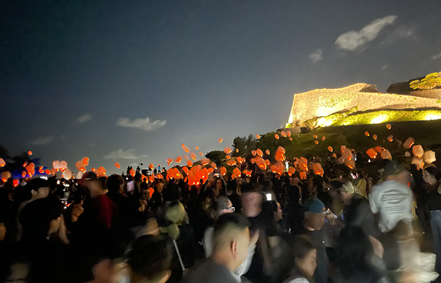 開催期間中、火を使わない安全性や環境にも配慮したLED仕様の200 個のランタンが毎回夜空に舞い上がり、勝連城跡を背景に幻想的な風景を生み出しました。ランタンにメッセージを書き、光に託すお客さまの姿も見かけられました。最終日は「全島獅子舞フェスティバル」も共催されました。